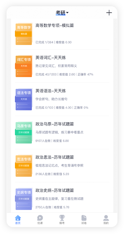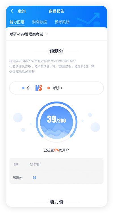 基于考試大綱,緊跟考研備考節奏,模擬真實考試 現場,數據報告智能分析,讓你學習備考更高效